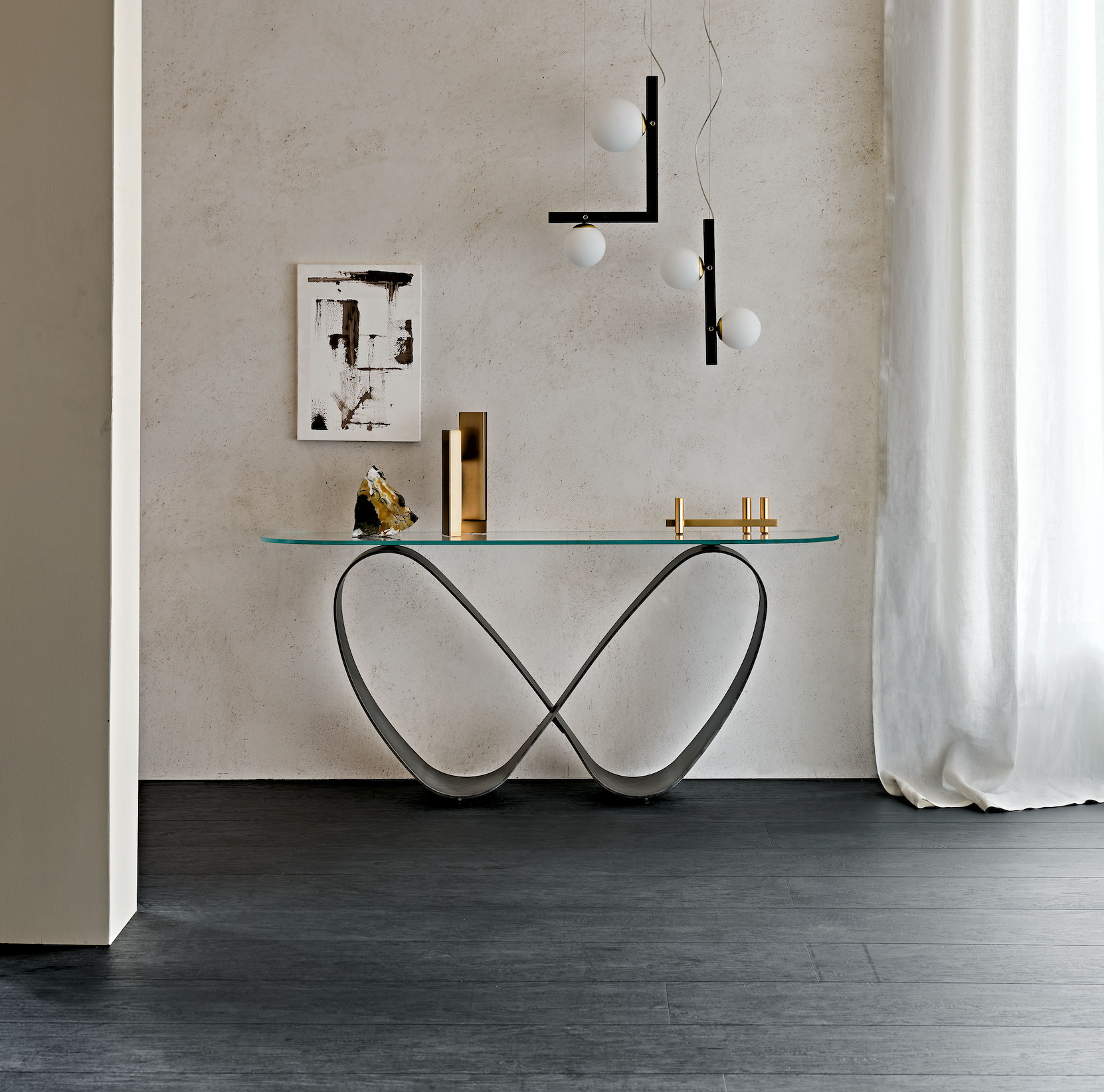 The Butterfly line is a sinuous architectural project that cannot go unnoticed. It includes an elegant glass table, a ceramic top version and a seductive design console. The steel base of the Butterfly design tables becomes the star of the modern dining room with a sculpture-like style and a reference to the elegance of nature. The consolle glass top is laid on the base, with its fragile appearance it creates a contrast with the bold and revolutionary combination of curves and edges. In the Butterfly Keramik version, the table is further embellished by the Marmi ceramic top, available in several exclusive shades. Finally, in the Butterfly Consolle model, the glass top takes on an unprecedented shape with rounded sides, whose proportions arise from the harmonious design of the base.