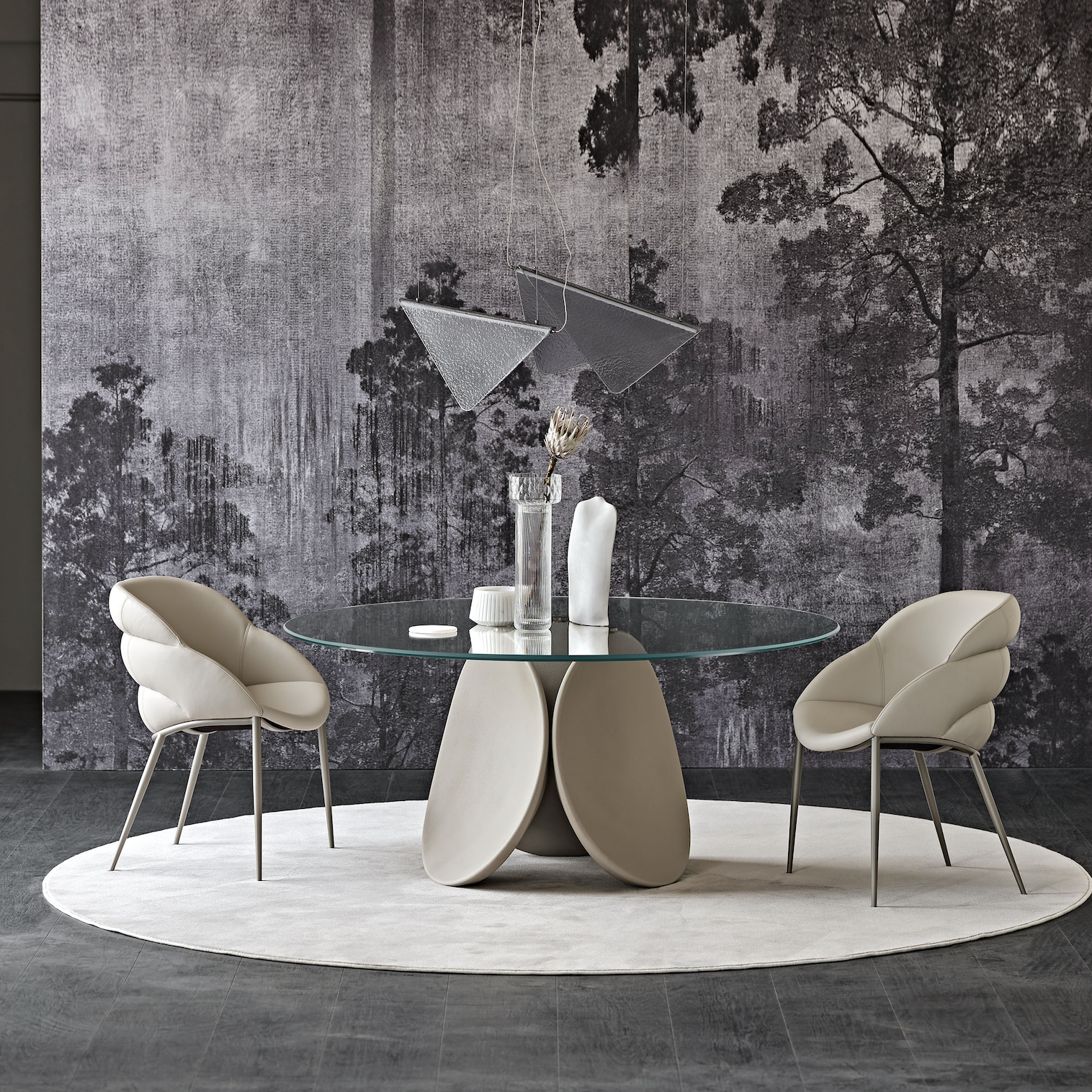The industrialised processes are only to support the high artisan component of the manual phases of pouring the liquid cement and the finishing. The base of this modern table is in fact finished in clay, with earthy and natural shades. Maxim comes in two versions: a round table with a transparent glass top that lets you appreciate the sculptural base in its entirety, and the Maxim Argile model completely spatulated in clay, lending it an even more organic look. This durable finish also makes Maxim ideal as an outdoor design table. “When the material is sufficient in itself, without superstructures or additions, we have a pure and direct object that is already a finished product,” explain the designers Pio and Tito Toso.