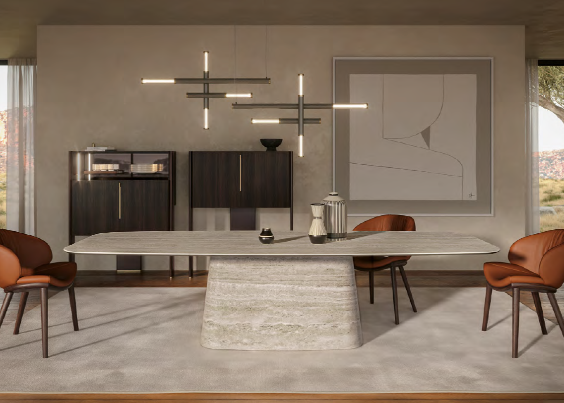 Tables with a central Napoleon base are joined by two perfectly symmetrical hubs. One detail is noticeable on the short side of the plinth: the recessed vertical groove covered in ceramic, which breaks up the otherwise uniform surface. The result is a modern ceramic table that embodies a new contemporary aesthetic, combining classic finishes inspired by natural marble with previously unseen production techniques.