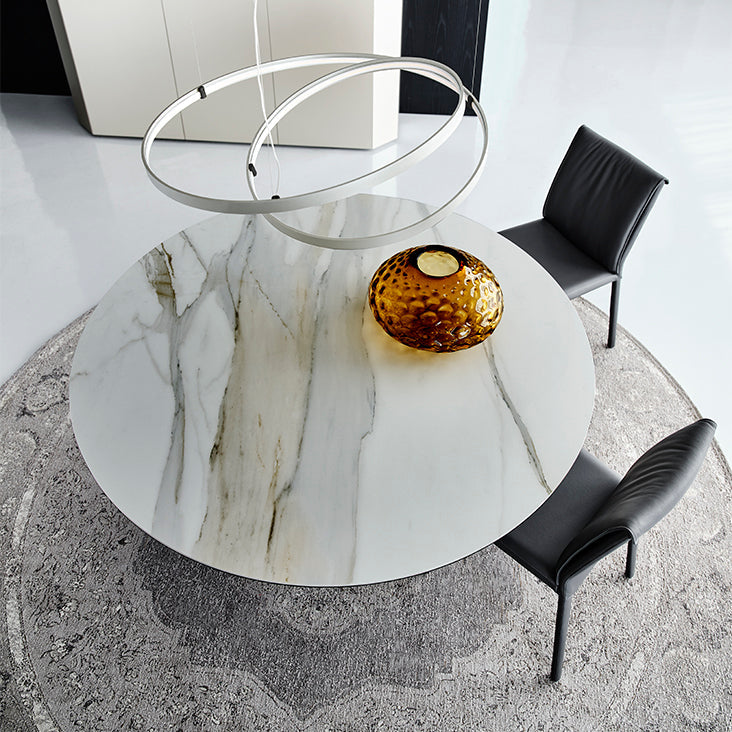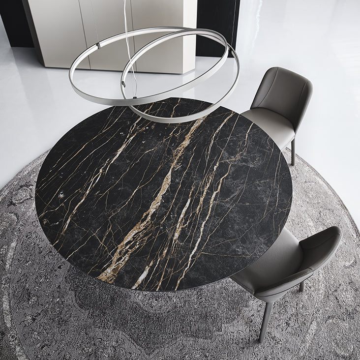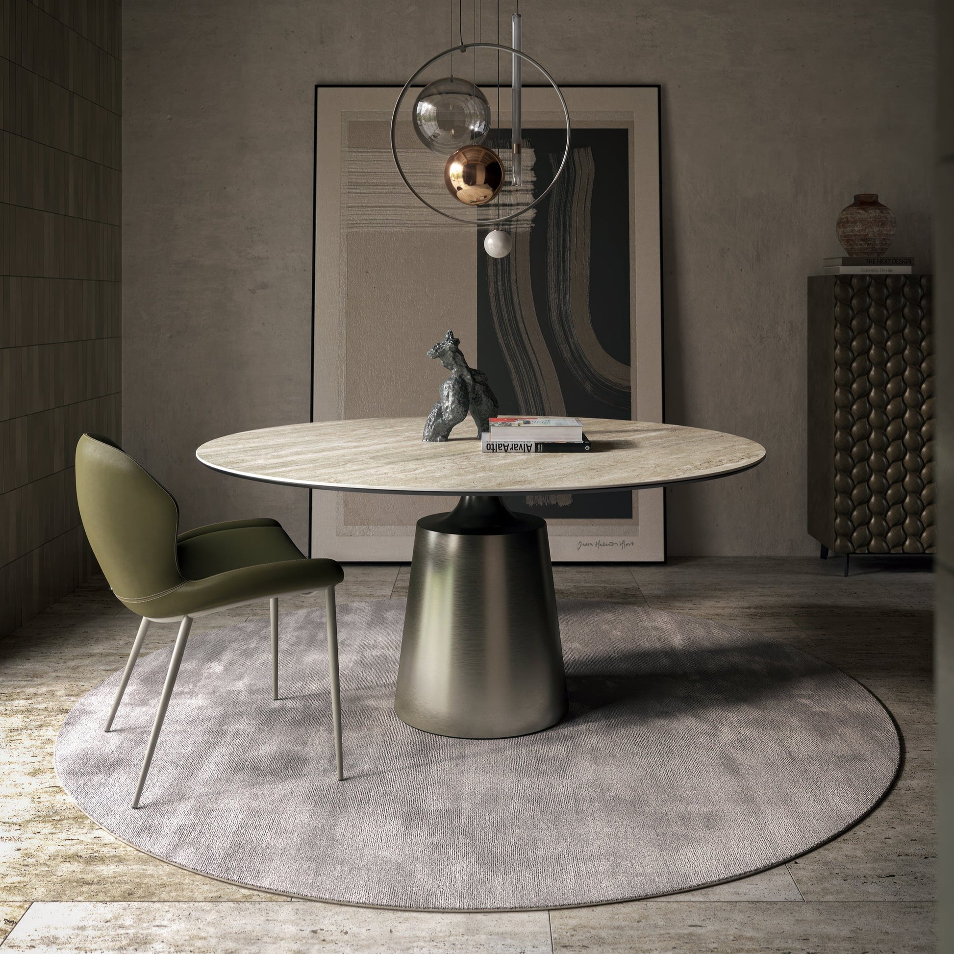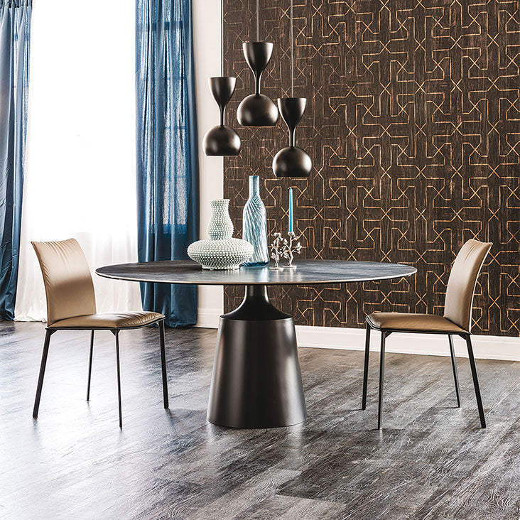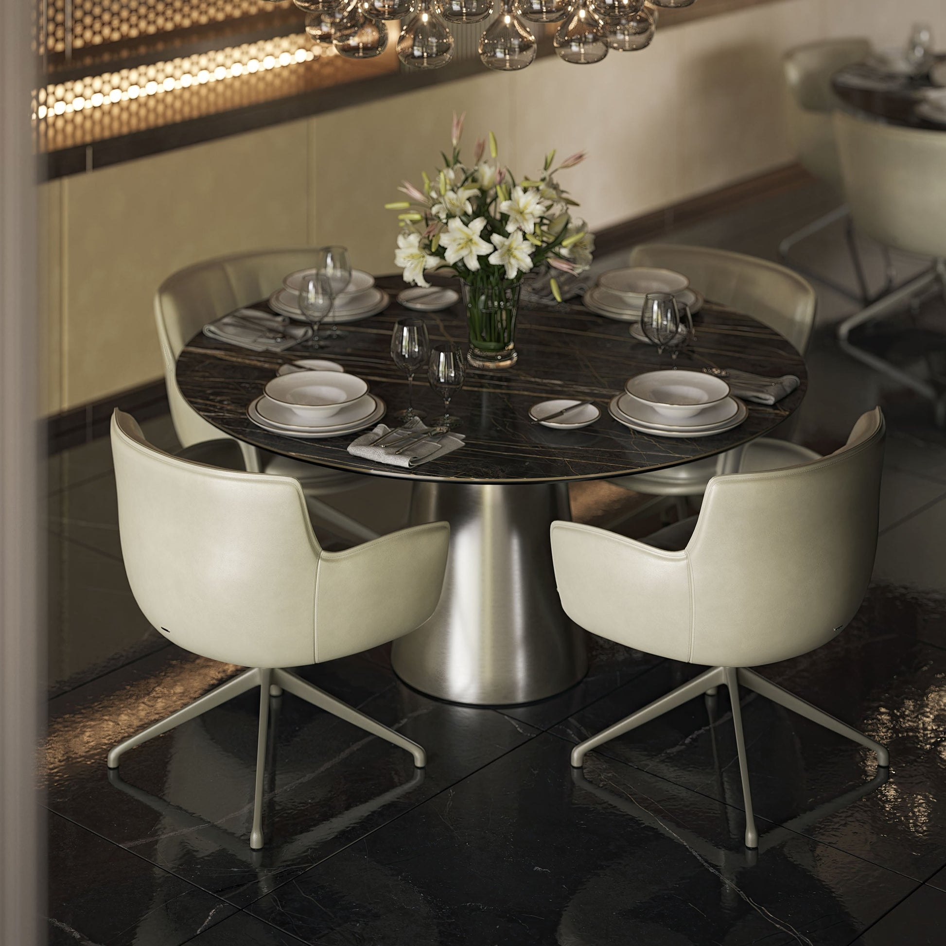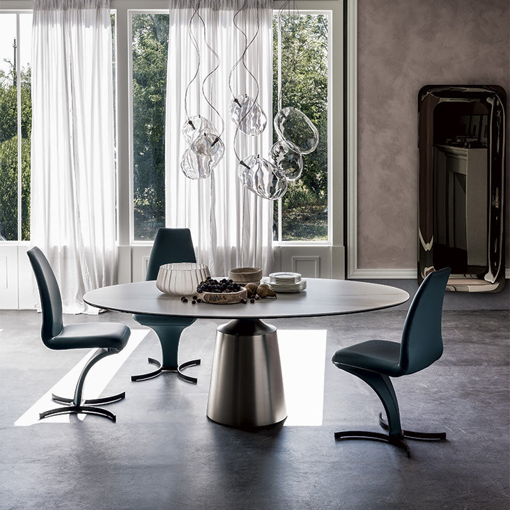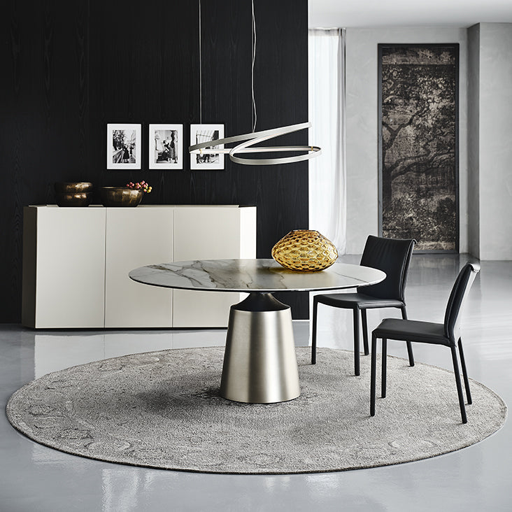 One of the most popular models among Cattelan Italia's round dining tables is the Yoda family, consisting of several variants from which to choose to personalise your design dining room. The base consists of a central truncated cone, the robust appearance is lightened by the metallic finish and by the connection with the narrow, recessed top, as if to resemble a long, elegant neck supporting the table top.